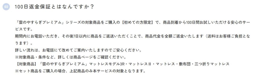 で購入した雲のやすらぎプレミアムⅡマットレスであること。 - 家に届いて101日~115日の間にカスタマーサポートに電話で連絡、アンケートを記入する。