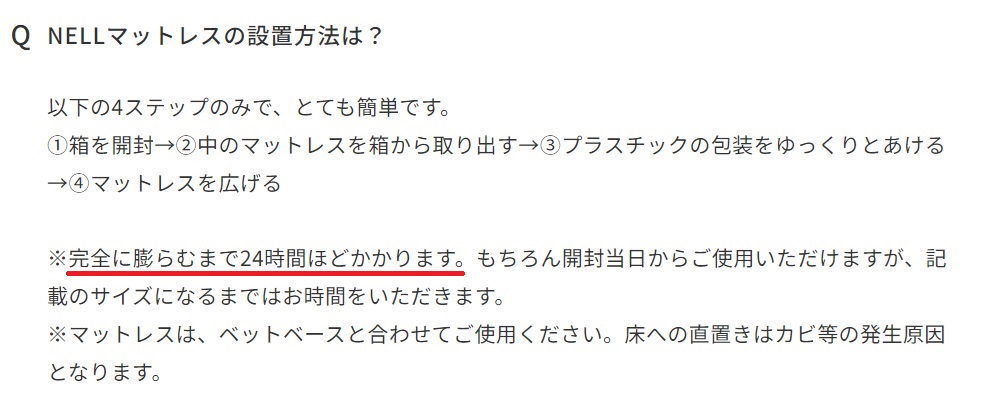 ネルマットレスが完全に膨らむまでは24時間。